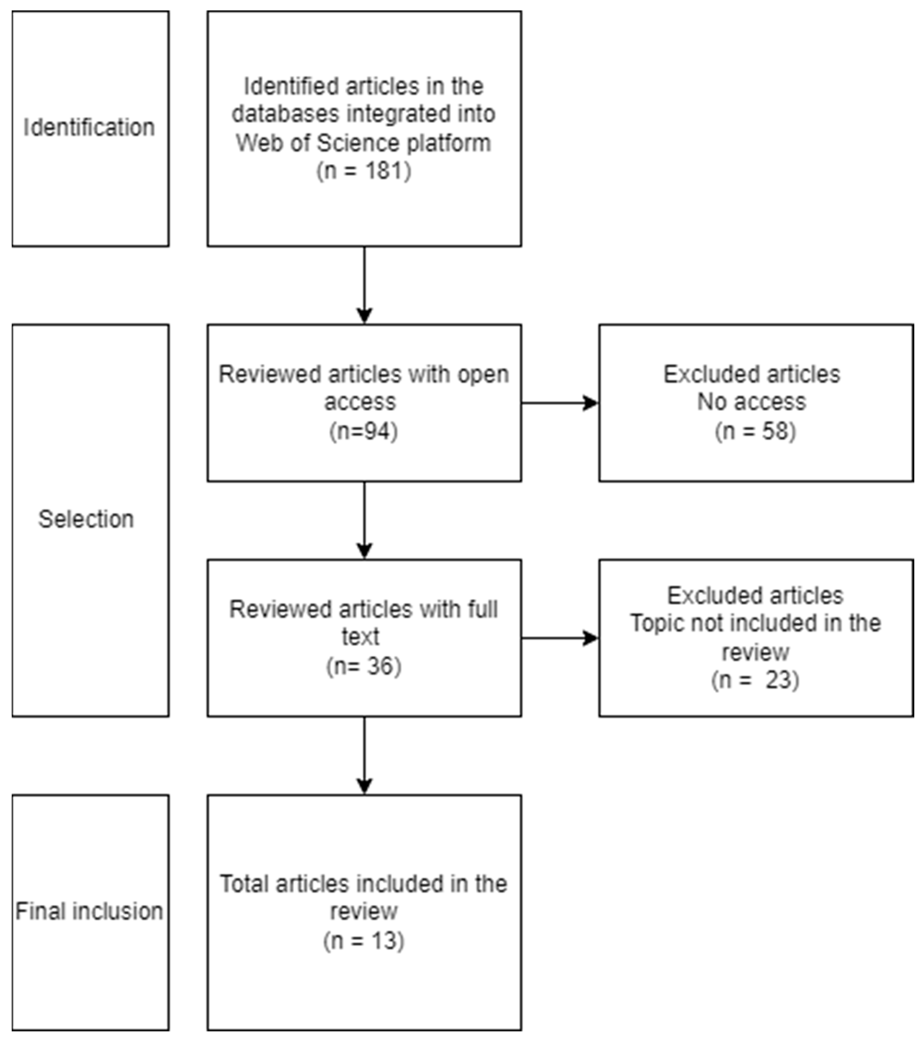 - Tricco, A.C.; Lillie, E.; Zarin, W.; O’Brien, K.K.; Colquhoun, H.; Levac, D.; Moher, D.; Peters, M.D.J.; Horsley, T.; Weeks, L.; et al. PRISMA extension for scoping reviews (PRISMA-ScR): Checklist and explanation. Ann. Intern. Med. 2018, 169, 467–473. [Google Scholar] [CrossRef]