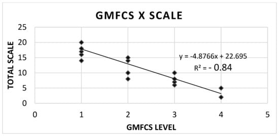 The SCALE scores and GMFCS levels showed a high inversely proportional correlation; in other words, the worse the SCALE score, the higher the GMFCS. This was shown by the strong negative result of Spearman’s correlation coefficient, R2 = −0.84, p < 0.001 (Figure 1).