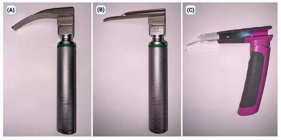 Laryngoscopes used in the study: (A) Macintosh laryngoscope (MAC), (B) Miller laryngoscope (MIL), and (C) bébé Vie Scope laryngoscope (VSL).