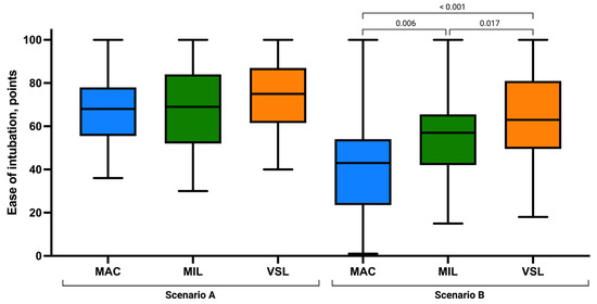 Ease of intubation using the Macintosh (MAC), Miller (MIL), and VieScope (VSL) laryngoscopes in two scenarios: without chest compressions (Scenario A) and during uninterrupted chest compressions (Scenario B). Data are presented as box-and-whisker plots showing the median, interquartile range, and minimum and maximum values.