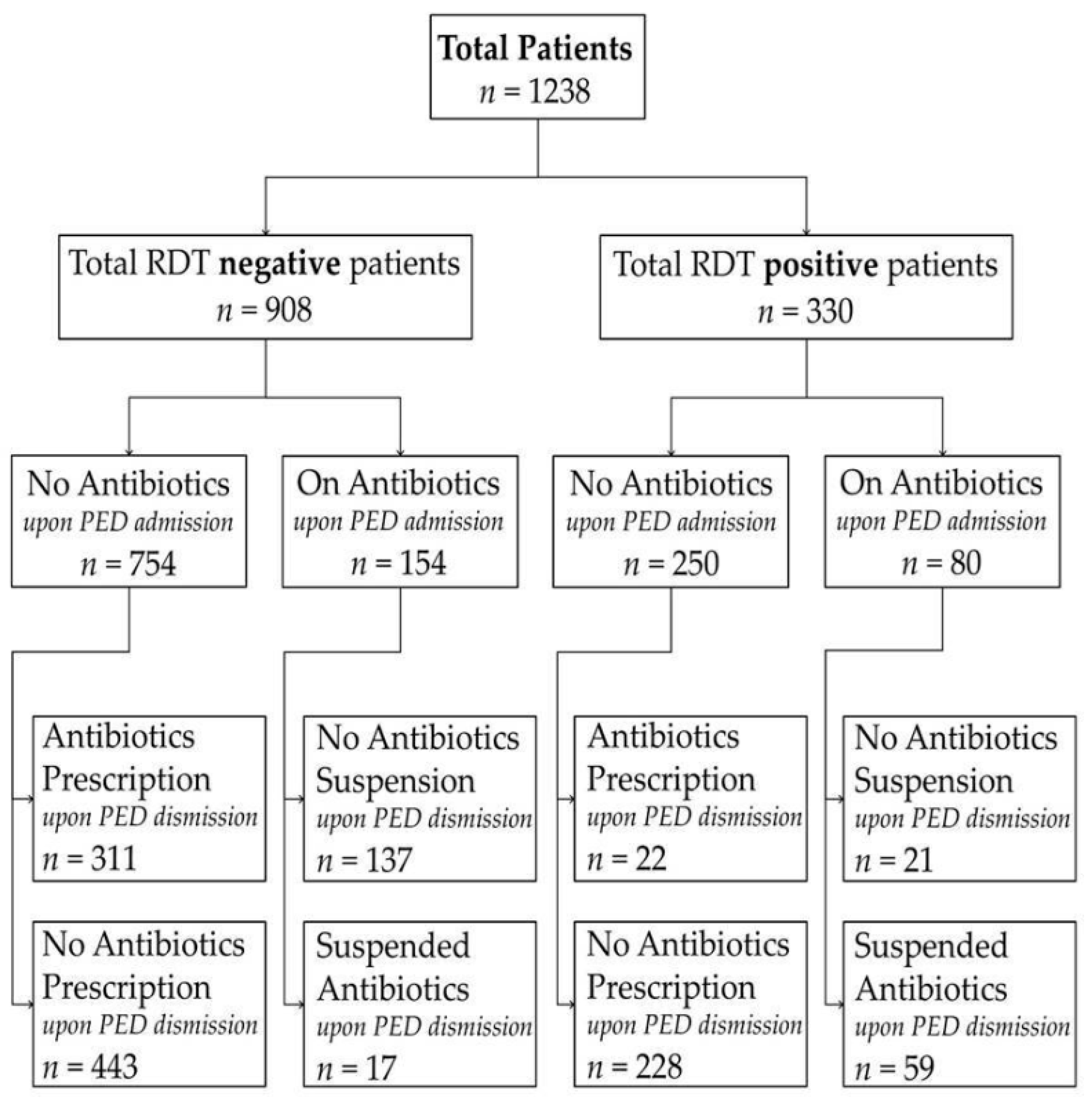 Figure 1. Flowchart of patient selection and antibiotic management according to rapid diagnostic test (RDT) results. The figure illustrates the study cohort stratified by RDT result (positive vs. negative) and antibiotic status at pediatric emergency department (PED) admission (on antibiotics vs. not on antibiotics). For each subgroup, antibiotic management at PED discharge (initiation, continuation, or suspension) is reported. All antibiotic decisions refer to discharge management and were made after availability of bedside RDT results.