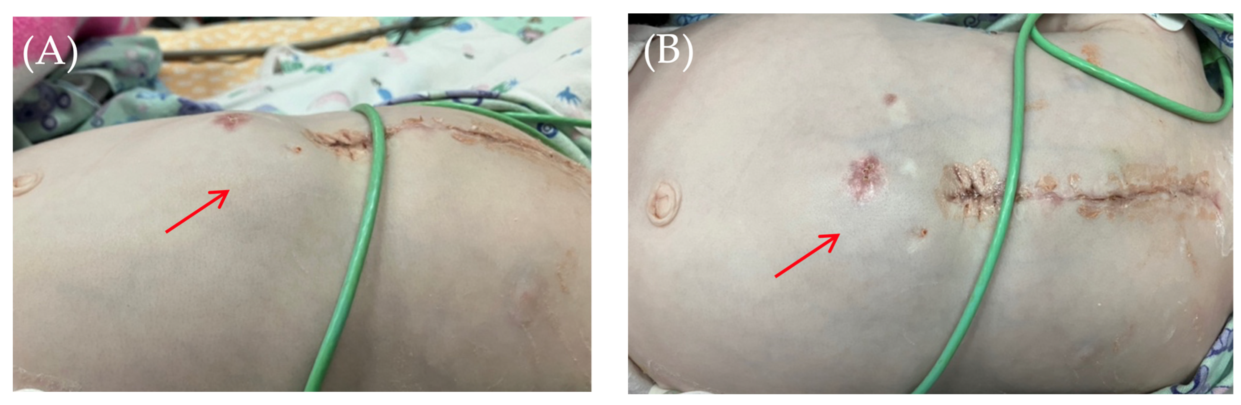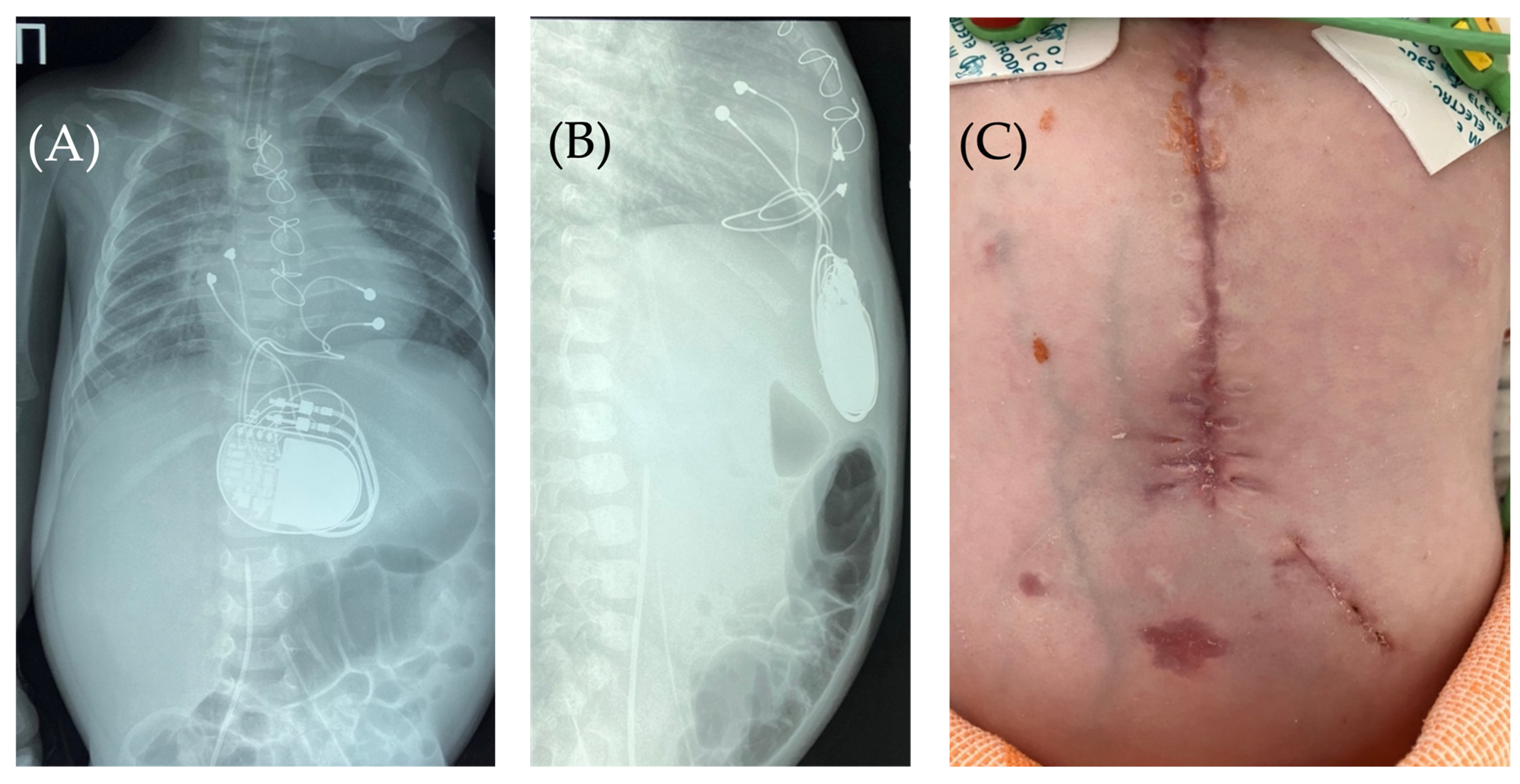 At 9 months of age, the child had both VSDs closed with a xenopericardial patch and pulmonary artery repair with an autologous pericardial patch. In the early postoperative period, the child developed hemodynamically significant second-degree atrioventricular block (Mobitz type 2), which required temporary dual-chamber pacing. The heart block persisted during the 13-day postoperative follow-up period.