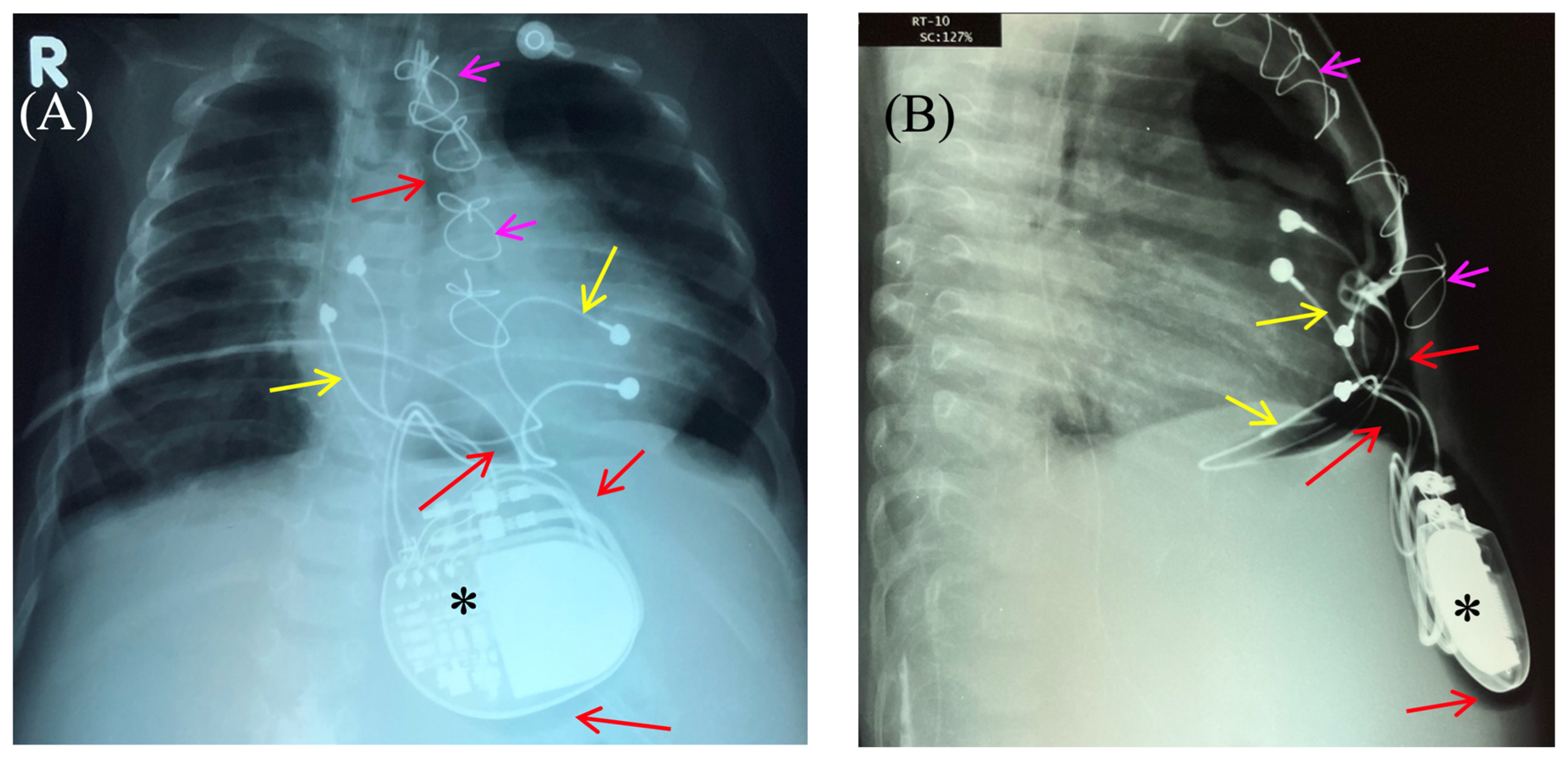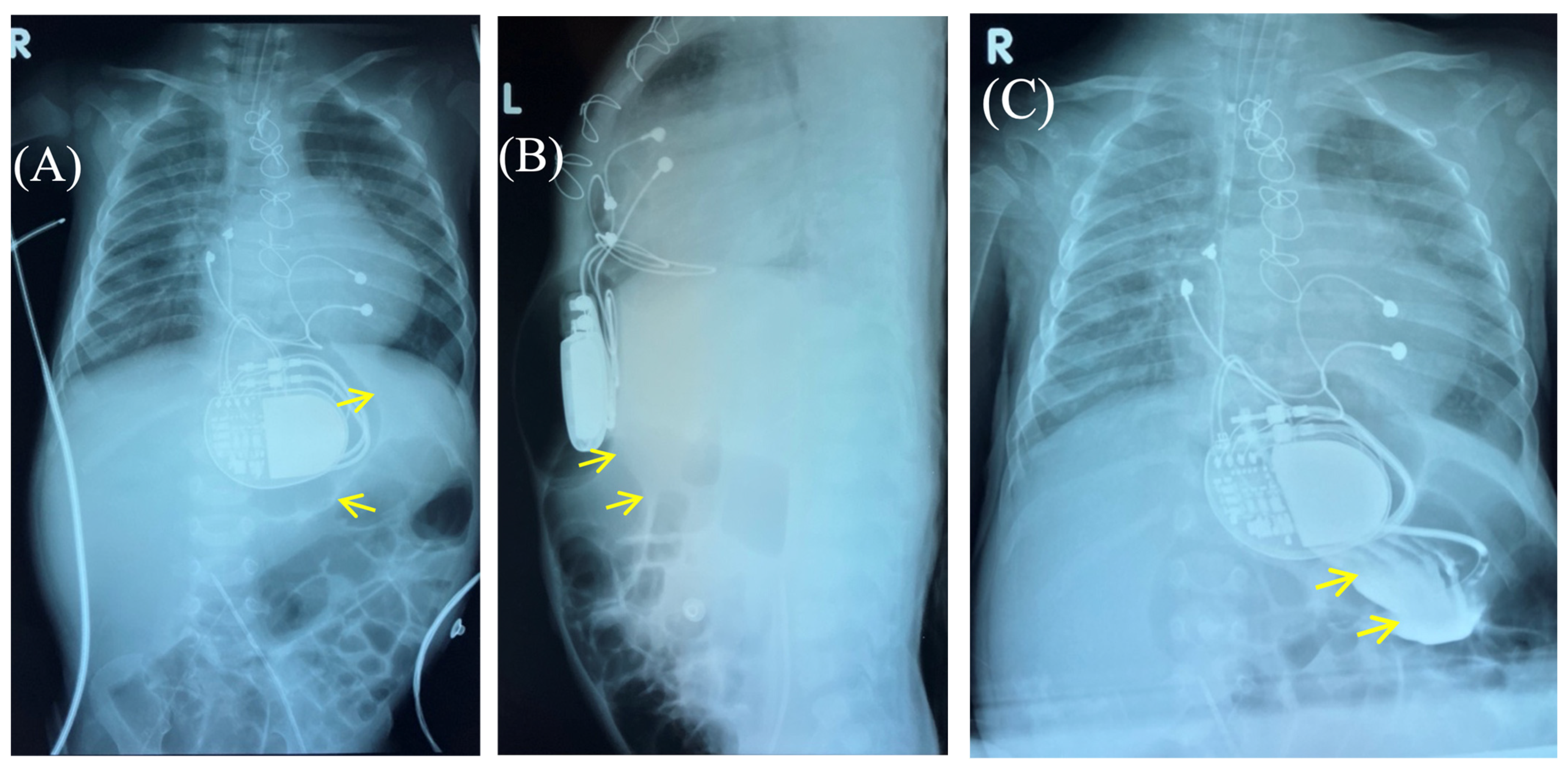 - Lo, S.-W.; Chen, J.-Y. Case report: A rare complication after the implantation of a cardiac implantable electronic device: Contralateral pneumothorax with pneumopericardium and pneumomediastinum. Front. Cardiovasc. Med. 2022, 9, 938735. [Google Scholar] [CrossRef] [PubMed]
