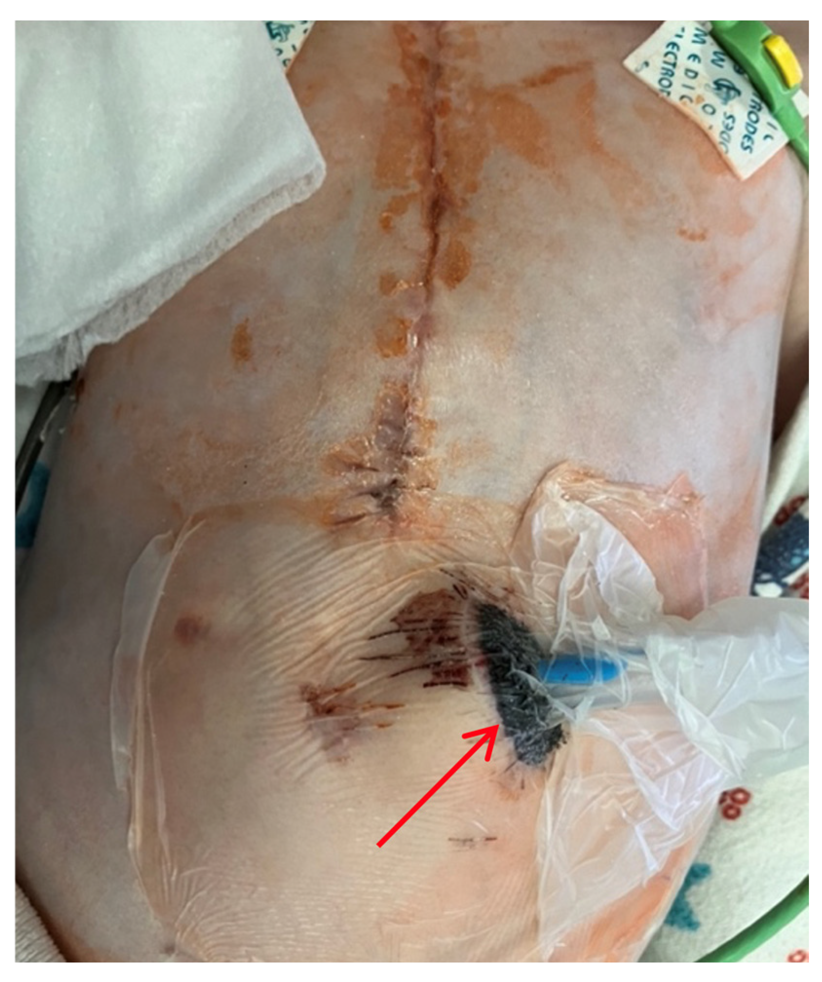 Based on these data and the clinical presentation, a permanent epicardial dual-chamber pacing system (Medtronic Attesta ATDR01; mode: DDD; atrial and ventricle leads pace and sense polarity: bipolar; lower rate: 90 ppm; upper track: 160 ppm; paced AV delay: 200 ms) was implanted. Implantation of the epicardial pacing system was performed through a median sternotomy. Because this was a sternal reentry, the pleural cavities, retrosternal space and pericardium all communicated. After cardiac mobilization, electrodes were attached to the atria and ventricles; the electrode impedance, sensitivity, and pacing threshold were measured in selected epicardial zones. A pacemaker pocket was created in the anterior abdominal wall beneath the abdominal muscles. Although it was isolated from the pericardium by suturing, there was still communication with the pericardial space along the electrodes. Immediately postoperative, pacemaker function was normal. Signs of gastrointestinal (GI) infection were noticed in the early postoperative period, accompanied by episodes of fever, loose stools, increased intestinal gas, and abdominal distension. Several attempts to extubate the patient failed, which caused prolonged mechanical ventilation.