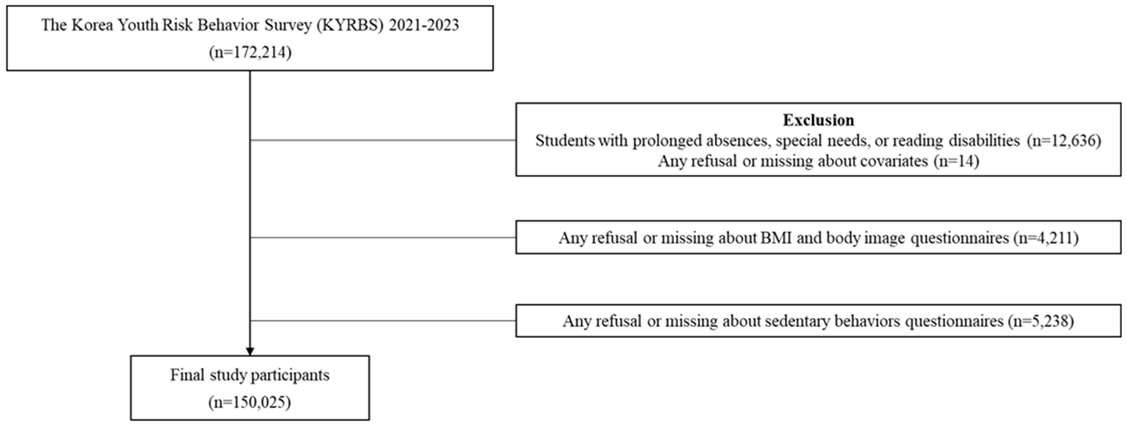Chicago/Turabian StylePark, Suin, Heesoo Lee, Wanhyung Lee, and Mi-Jeong Lee. 2026. "Association Between Sedentary Behavior and Body Image Distortion Among Korean Adolescents Considering Sedentary Purpose" Children 13, no. 1: 20. https://doi.org/10.3390/children13010020