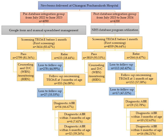 Congenital hearing loss, one of the most common sensory disorders in newborns, has an estimated global incidence of 1–3 per 1000 live births, with Thailand reporting a similar prevalence of approximately 1.7 per 1000 live births [1,2]. The consequences of undiagnosed or delayed identification of hearing loss in newborns are profound and enduring. Children with unrecognized hearing impairment are at heightened risk for delayed speech and language development, impaired cognitive skills, reduced academic achievement, and long-term social and emotional difficulties [3,4]. These outcomes are often preventable if hearing loss is detected and managed early in life. In response, many countries have adopted the Early Hearing Detection and Intervention (EHDI) framework, a structured public health approach designed to identify and manage congenital hearing loss during the first months of life. Over the past decade, several low- and middle-income countries (LMICs), including Thailand, have made substantial strides in expanding Universal Newborn Hearing Screening (UNHS) programs. Thailand has implemented a national UNHS program since 2021; however, national performance indicators remain variable across regions. National reports indicate that screening coverage typically ranges from 93.10% to 99.78%, with referral rates between 2.51% and 14.49%, and diagnostic completion within three months ranges from 20.13 to 90.91%, particularly in public hospitals with limited audiology resources [5,6,7]. Hearing-aid fitting before six months of age is similarly uncommon, reflecting systemic barriers to early intervention. These efforts have been supported by national policies and structured pilot programs under the Ministry of Public Health, which have promoted NHS implementation and digital reporting systems across multiple provinces [8,9]. However, the implementation of UNHS in LMIC settings continues to face critical systemic and operational challenges. Additionally, Thailand’s national NHS algorithm underwent a major revision in July 2023, changing from screening within seven days and rescreening at three months to screening within 24–48 h after birth and rescreening at one month. A major barrier lies in the limitations of data collection, tracking, and coordination mechanisms within healthcare institutions. In many resource-limited settings, including tertiary hospitals in Thailand, the absence of integrated digital systems has led to fragmented workflows for hearing screening programs. Prior to the introduction of a dedicated digital platform, Chiangrai Prachanukroh Hospital, a regional tertiary referral center in northern Thailand, relied on google forms and multiple manual spreadsheets, which were used across different units and screening periods to manage data. While accessible, these tools were not designed for longitudinal tracking or interdepartmental coordination. Screening results were often recorded in isolation and required extensive cross-checking for follow-up scheduling. Fragmented data across maternity, pediatric, and audiology services created delays and discrepancies in identifying newborns requiring rescreening or diagnostic ABR testing. The inability to generate automated alerts or unified follow-up lists increased the risk of missed cases. Moreover, the manual nature of reporting limited the hospital’s ability to monitor indicators such as screening coverage, referral rates, follow-up return rates, and age at diagnosis. To address these gaps, the hospital implemented a dedicated Newborn Hearing Screening (NHS) database in 2023. This standalone platform centralized data, supported structured entry, and generated follow-up lists, enabling semi-automated workflows and improved tracking. The transition represented a critical turning point, but the actual impact of database implementation on program performance remains insufficiently documented in LMICs. This study evaluated the advantages and limitations of NHS database adoption, focusing on coverage, referral, follow-up tracking, and diagnostic completion, while describing operational improvements and persisting challenges.