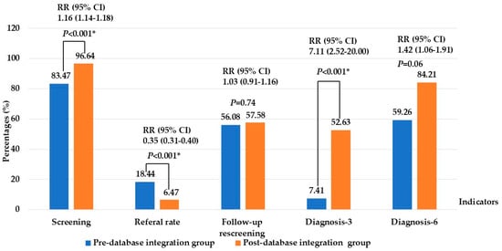 Comparison of key performance indicators of newborn hearing screening between pre- and post- database integration. Note: * Significant at p-value < 0.05; Screening: screening ≤ 1 month of age; Diagnosis-3 and -6: audiological diagnosis ≤ 3 and -6 months of age.