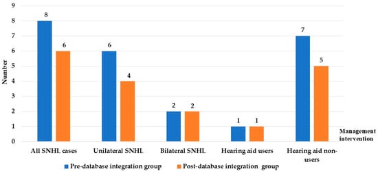 Distribution of SNHL cases and hearing aid management between pre- and post- database integration. Abbreviation: SNHL, sensorineural hearing loss.