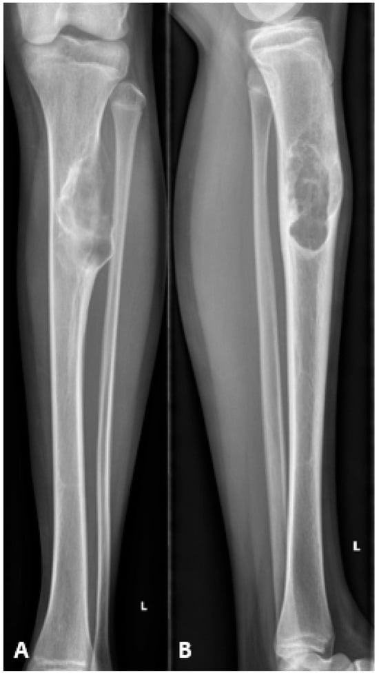Preoperative radiographs showing an osteofibrous dysplasia-like adamantinoma (OFD/LA) in the left tibial diaphysis. (A) Anteroposterior view. (B) Lateral view.