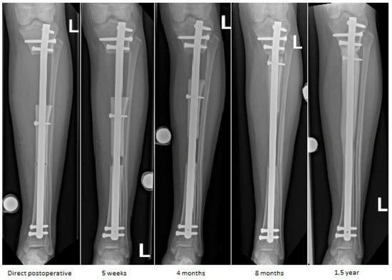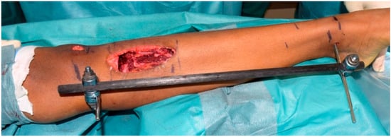 - Kold, S.; Christensen, K.S. Bone transport of the tibia with a motorized intramedullary lengthening nail—A case report. Acta Orthop. 2014, 85, 333. [Google Scholar] [CrossRef]
