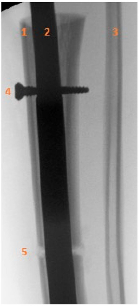 Figure 5. Intraoperative anteroposterior radiograph showing the locking bolt inserted into the transport segment. (1) Proximal tibial diaphysis and transport segment. (2) Intramedullary nail. (3) Intact fibular diaphysis. (4) Locking bolt within the transport segment and internal motor of the intramedullary nail. (5) Distal tibia, osteotomy of the transport segment. - Nail locking: The nail was locked proximally and distally to achieve stable fixation.