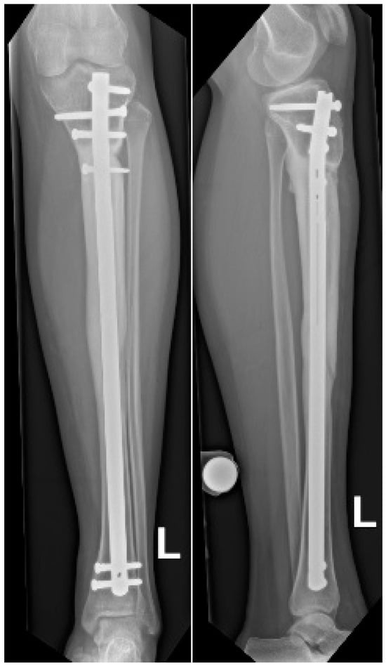 Radiographs at 18 months follow-up showing anteroposterior view (left) and lateral view (right) of the tibia. Consolidation can be observed, demonstrated by bridging callus across cortices and the absence of visible fracture lines, with restoration of tibial alignment.