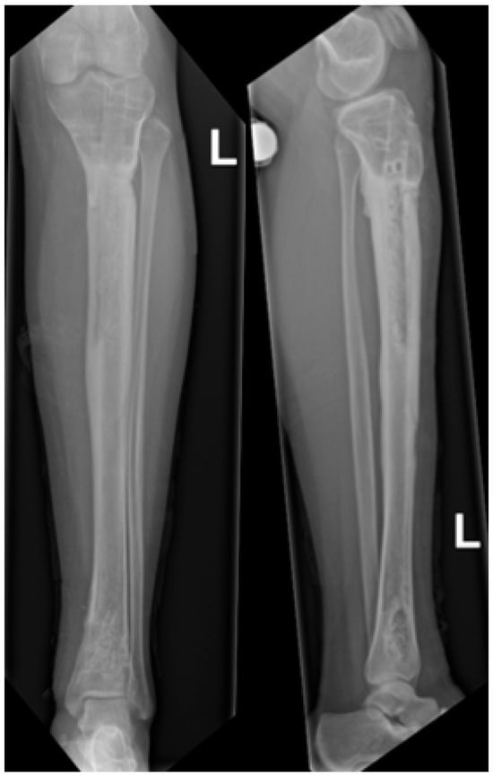 - Dala-Ali, B.; Donnan, L.; Masterton, G.; Briggs, L.; Kauiers, C.; O’sUllivan, M.; Calder, P.; Eastwood, D.M. Osteofibrous dysplasia of the tibia: The importance of deformity in surveillance. Bone Jt. J. 2022, 104-B, 302–308. [Google Scholar] [CrossRef]