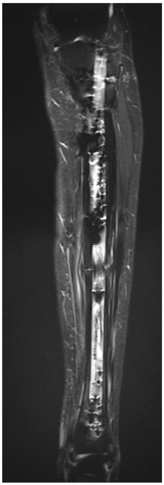 Postoperative MRI following hardware removal, T1 TIRM sequence, coronal plane, showing no residual lesion, no abnormal signal, and preserved tibial architecture at the previous lesion site, consistent with absence of recurrence.