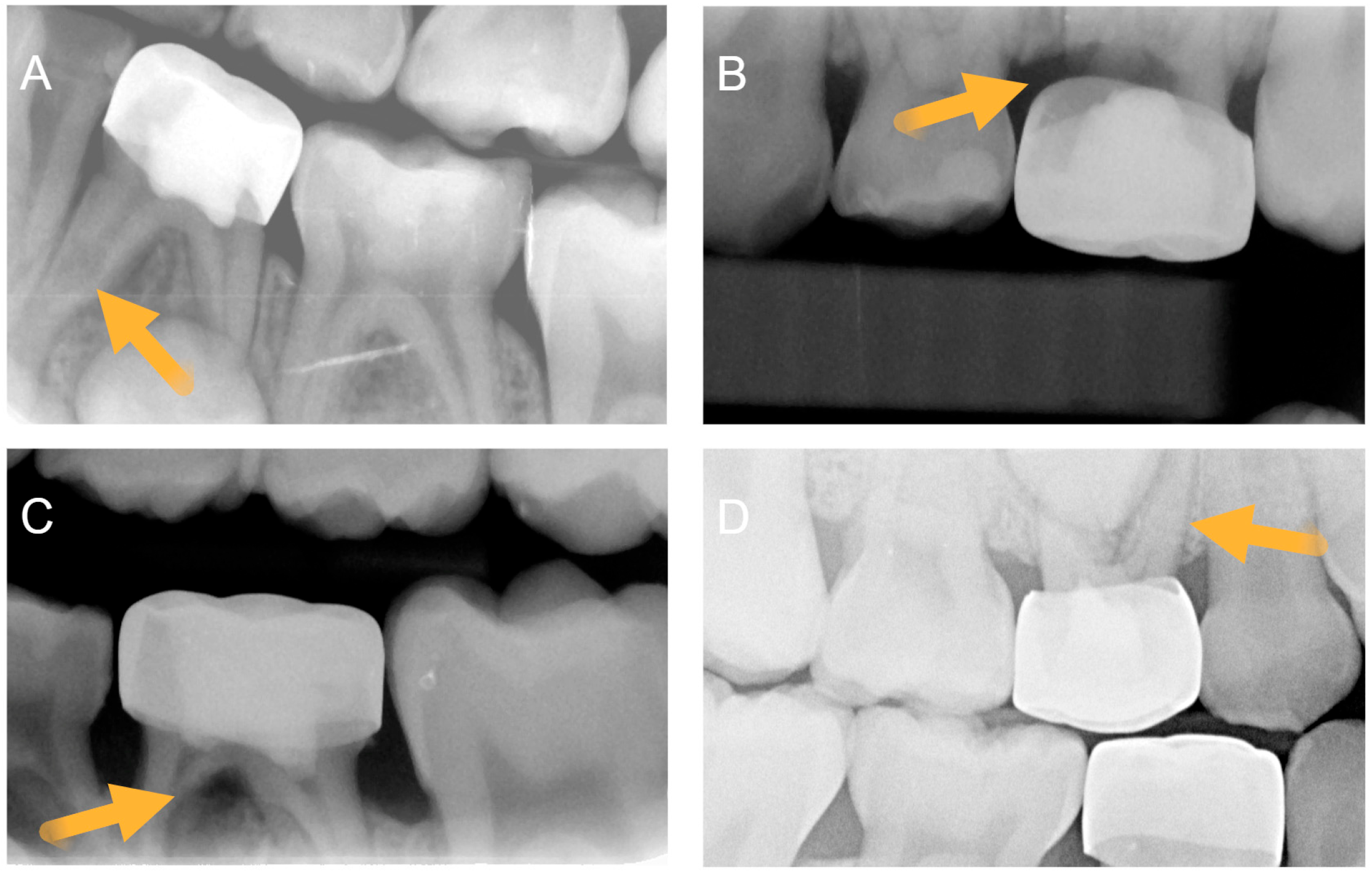 - Radiographic pathosis—internal resorption without perforation, internal resorption with perforation, and/or furcation radiolucency.