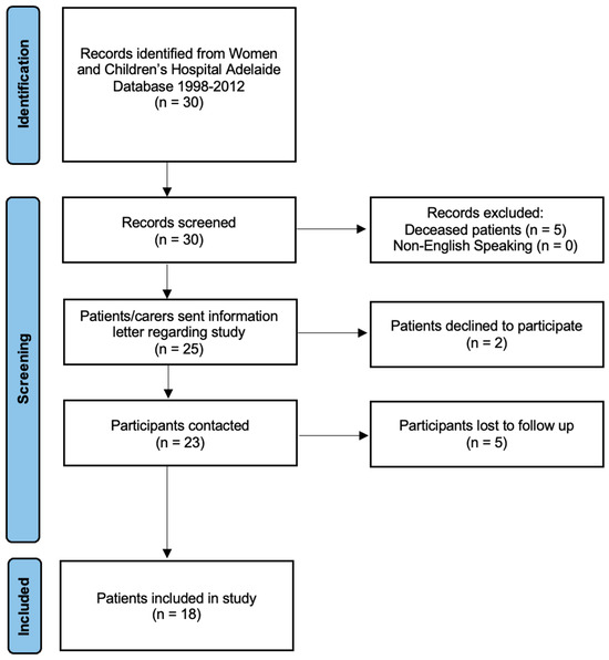 Thirty participants were identified through operative records using the search terms “triple”, “arthrodesis”, “triple arthrodesis”, “subtalar arthrodesis”, “hindfoot fusion”, “triple fusion” and “hindfoot arthrodesis”. Patients that were deceased and those that did not speak English were excluded using demographic data obtained through Sunrise Electronic Medical Records and Oacis systems and the births, deaths and marriages register. Data were extracted from medical records including patient/carer details and details of the primary surgery including date, indication, complications and type of fixation.