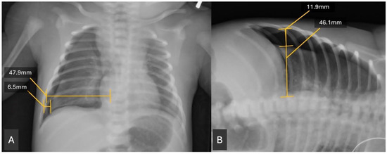 Pneumothorax (PTX) is defined as the accumulation of air within the potential space between the visceral and parietal pleura, sometimes leading to lung collapse. It may occur spontaneously, in the absence of trauma or other external factors, or from complications related to mechanical ventilation, infection, trauma, or certain disease processes. Neonatal pneumothorax occurs in approximately 1–2% of neonates admitted to the neonatal intensive care unit (NICU), with higher rates in premature infants and those weighing < 1500 g [1,2]. Mortality is increased in neonates diagnosed with pneumothorax [3]. Pneumothorax in neonates is diagnosed via chest transillumination, chest radiography, and less commonly, ultrasonography [4,5].