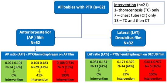 The primary outcome of the study was to determine if radiographic pneumothorax size ratio (PTX/hemidiaphragm) could predict the need for any procedural intervention. Secondary outcomes were to assess if clinical and demographic factors such as gestational age, birth weight, and associated diagnoses such as respiratory distress syndrome (RDS) could influence the likelihood of needing intervention.