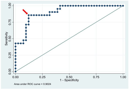 In classifying outcomes descriptively, those patients with an anterior–posterior ratio (APr) of <0.102 (39%) required no intervention, while all of those with a high APr of >0.187 (15%) required intervention. For the MID ratio range 0.104–0.183, 47% required intervention. A Receiver Operator Characteristic (ROC) curve was generated for the anterior–posterior ratio for outcomes any intervention/no intervention. We chose the APr since it was always available (higher n) and the lateral decubitus was not always available, so it may not be as applicable in the clinical setting. The resulting area under the curve (AUC) was 0.902 (CI 0.828–0.977) and an APr of 0.184 was identified as the “best” cutoff (arrow, Figure 3). This cutoff value was associated with the highest Youden index (J statistic = 0.74) of any cutoff and had a sensitivity of 86%, a specificity of 88%, and correctly classified 87% of the subjects.