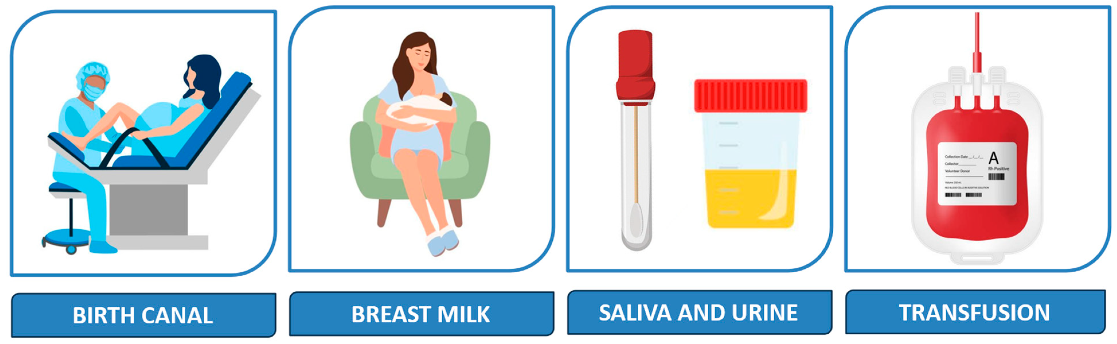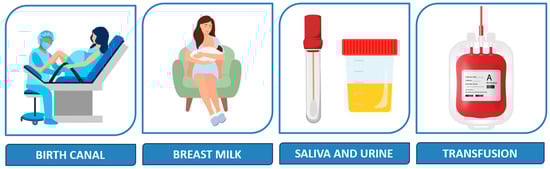 CMV is the most common cause of perinatally acquired infection worldwide [5], and mother-to-child transmission in the postnatal period occurs primarily but not exclusively via breastmilk [6,7,8], as shown in Figure 1.