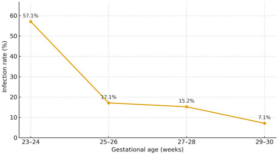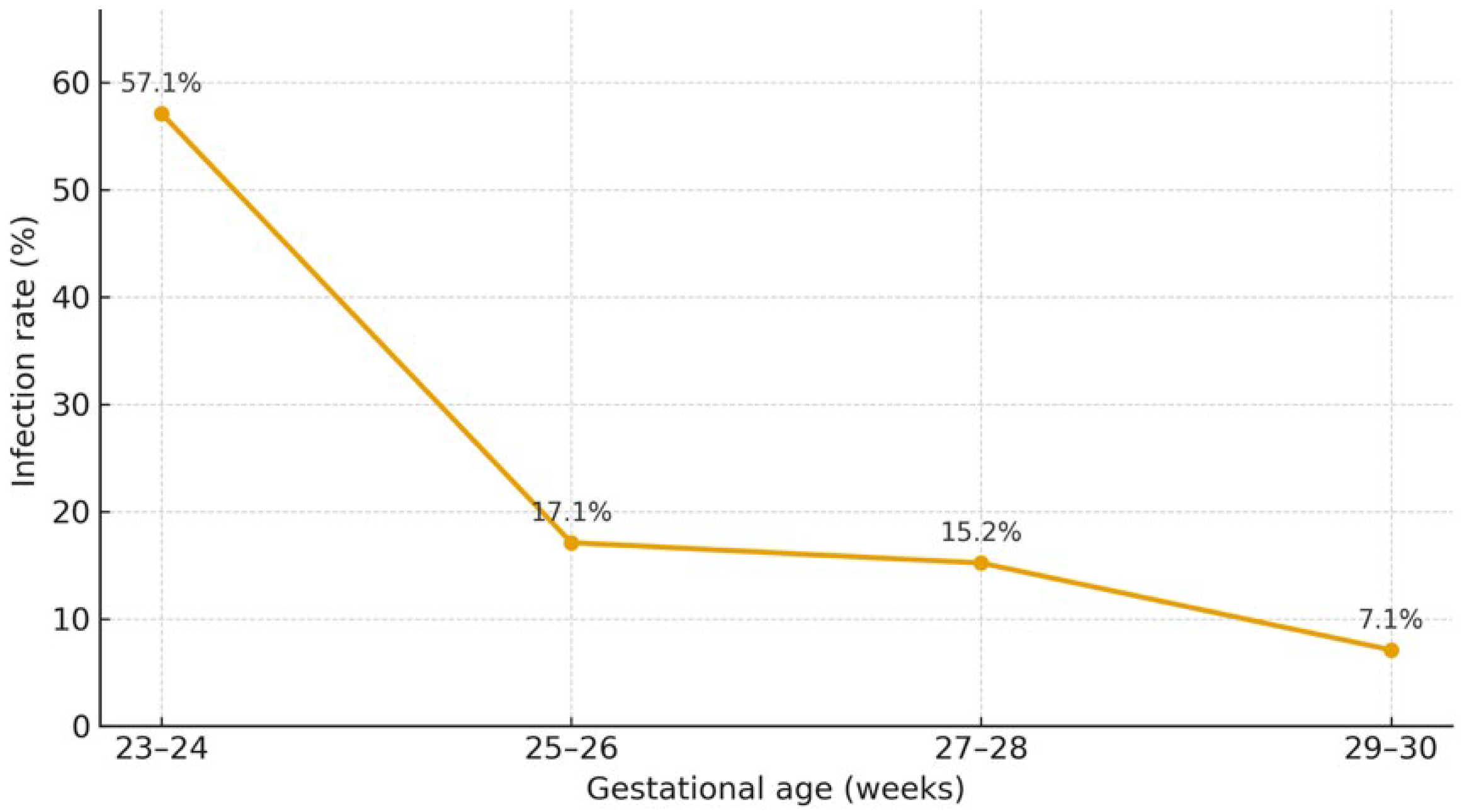 A recent meta-analysis estimated that CMV infection occurs in 16.5% of preterm infants born to CMV-seropositive mothers (10–26%), while CMV shedding in BM is detected in the majority of seropositive women (71–87%) [13]. Breastmilk–acquired infection affects approximately one fifth of exposed infants and is associated with a 1.6-fold higher risk of CMV acquisition compared with formula feeding [1], with gestational age acting as an important modifying factor, as shown in Figure 2. This could be related to the immaturity of premature infants’ immune systems and a lack of protective maternal antibodies, as these generally are transferred to the fetus only in the third trimester of pregnancy [2].