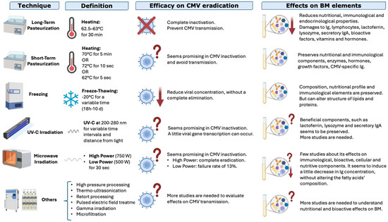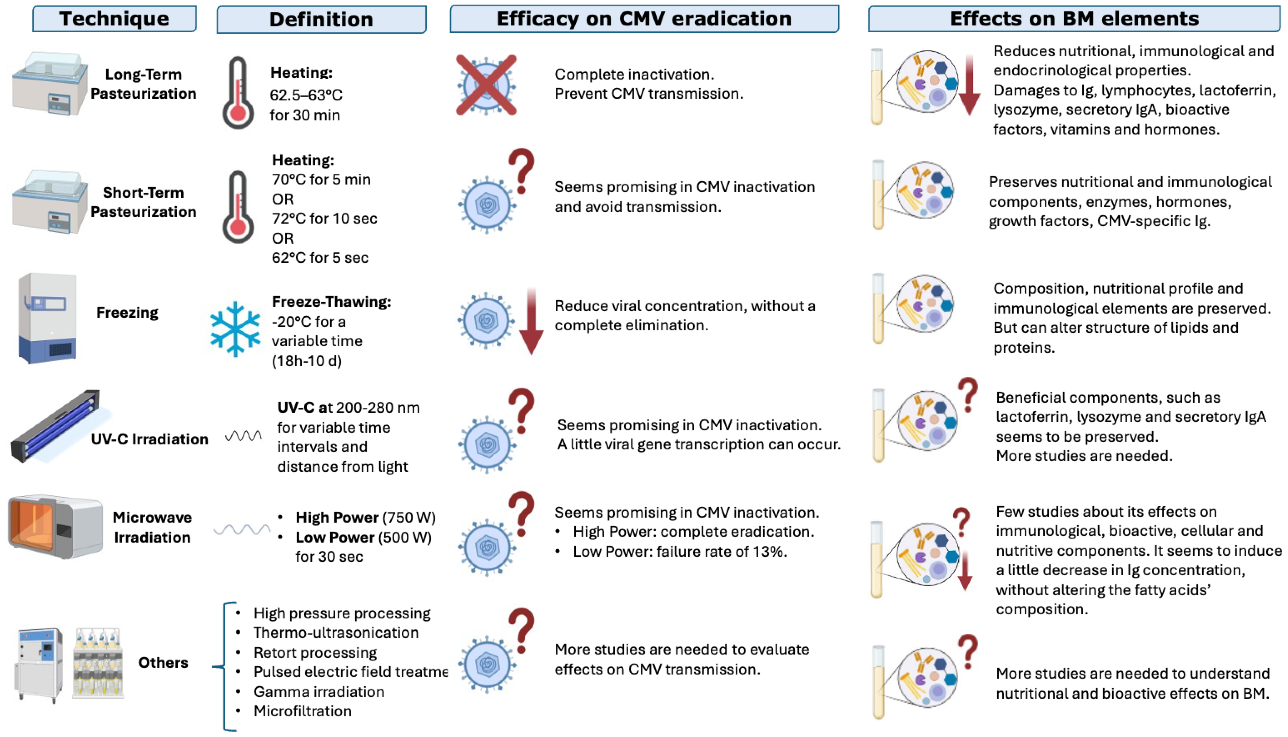 Several techniques can be used to treat BM and to reduce the risk of CMV transmission through this valuable superfood: some of them are able to completely eliminate the risk of CMV transmission but on the other hand can damage functional or nutritional substances. The options are analyzed below with the pros and cons of each; the analysis is summarized in Figure 5.