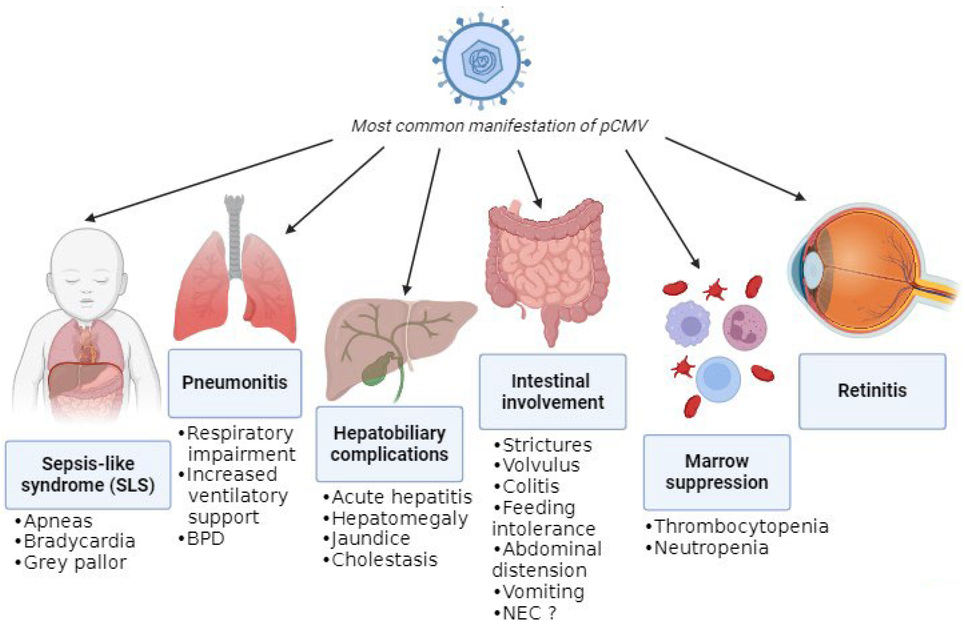 The absence of pathognomonic clinical features complicates attribution of disease to pCMV, as its manifestations closely resemble those of other infections and prematurity-related conditions. The most common manifestations are summarized in Figure 3.
