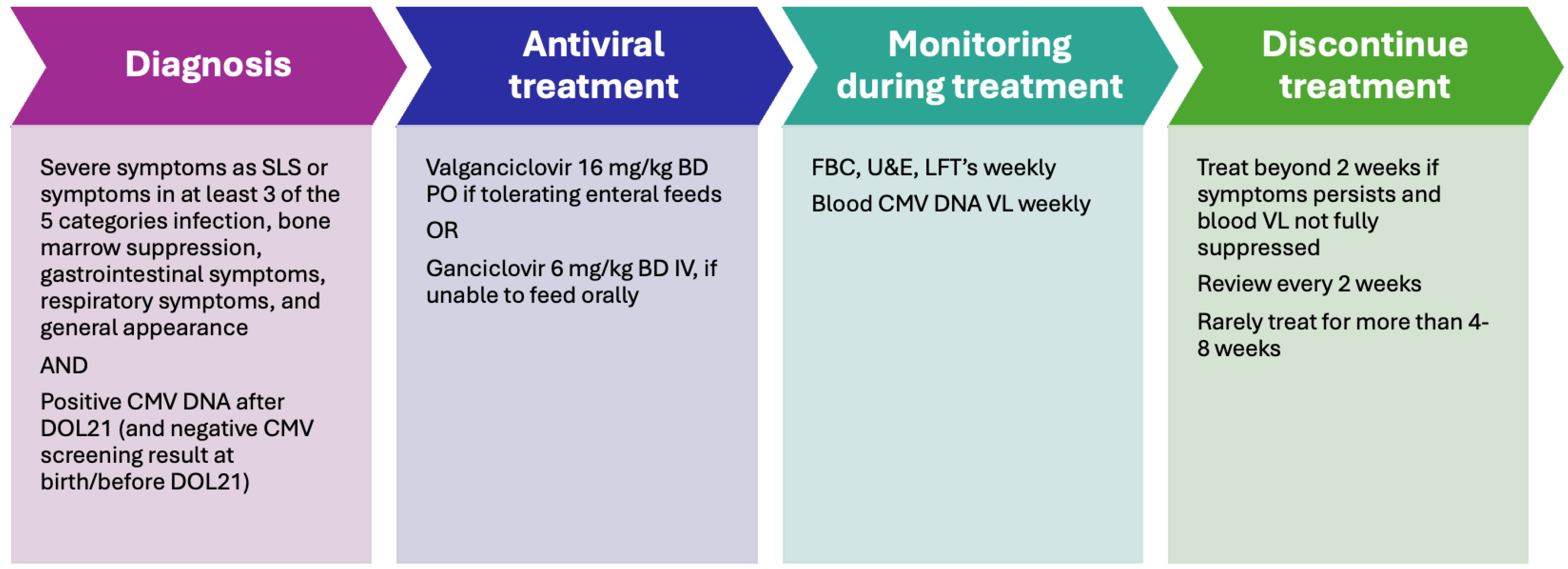 The infants most likely to benefit from antiviral therapy are those with confirmed severe postnatally acquired CMV disease; in these patients, treatment is aimed at suppressing active viremia and preventing progressive end-organ damage rather than modifying the course of chronic infection. Some authors have suggested monitoring CMV DNA levels in very-low-birthweight preterm infants during the breastfeeding period to enable a “pre-emptive” treatment approach when viral load increases, an approach similar to strategies used in immunocompromised patients to prevent severe CMV disease [65]. However, this approach is not currently widely accepted.