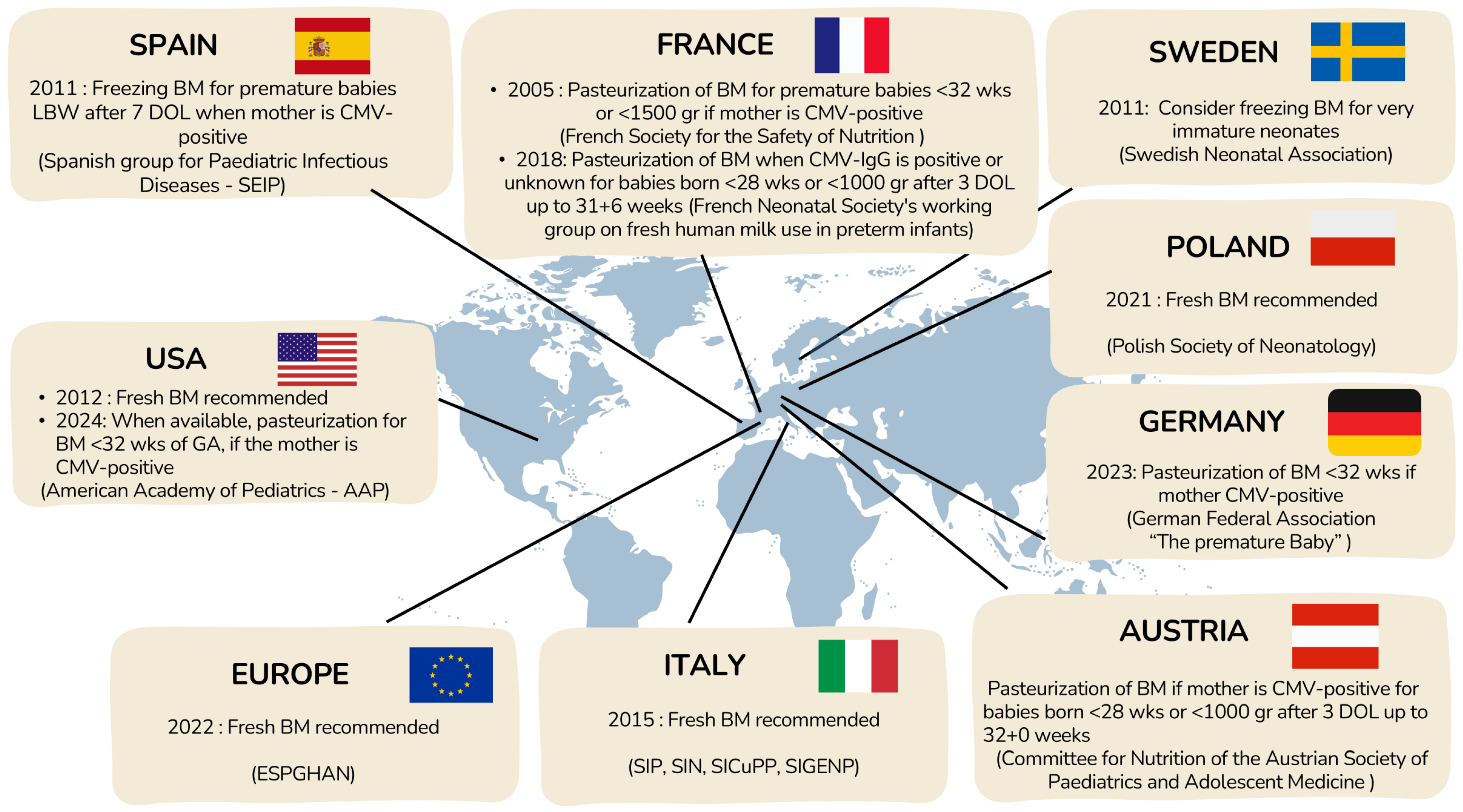 Breastmilk remains the optimal nutrition for preterm infants, and current evidence does not support withholding maternal milk because of the risk of CMV transmission; however, approaches to breastmilk handling (fresh, frozen, or pasteurized) in CMV-seropositive mothers vary widely across countries due to the lack of international consensus.