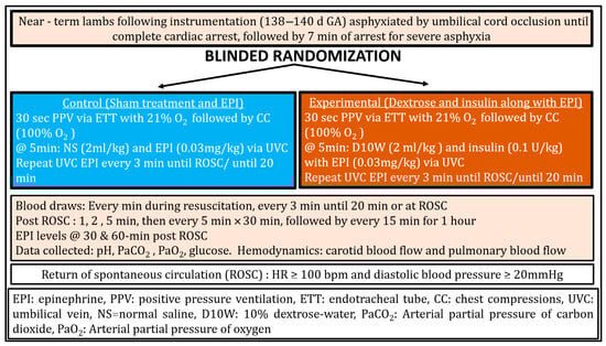 The aim of this proof-of-concept study was to evaluate the effect of dextrose and insulin co-administration, in addition to standard epinephrine therapy, on the incidence and timing of ROSC, as well as on hemodynamic parameters and gas exchange, in a near-term ovine model of prolonged asphyxial cardiac arrest.