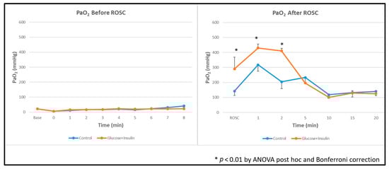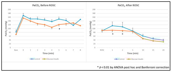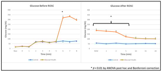 Blood glucose concentrations before and after resuscitation are shown in Figure 2. Despite insulin co-administration, post-ROSC blood glucose levels remained significantly elevated in the experimental group compared to the control group (p < 0.01 by ANOVA with Bonferroni correction).
