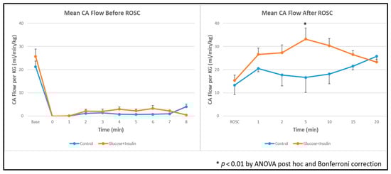 Left carotid artery blood flow during and after resuscitation. Data are presented as mean ± standard deviation. There was higher carotid artery blood flow in the dextrose and insulin group post ROSC at 5 min. * p < 0.01 at 5 minutes post-ROSC by ANOVA with Bonferroni post hoc correction comparing experimental vs. control groups. ROSC: Return of spontaneous circulation (ROSC).