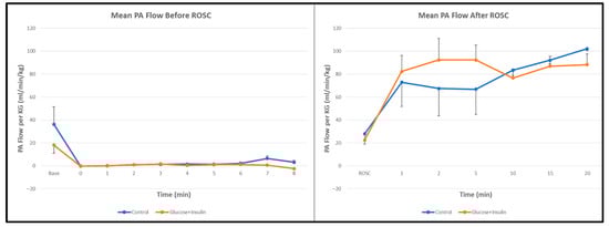 Pulmonary Blood Flow: Pulmonary artery blood flow before and after ROSC was similar between groups (Figure 4, p = 0.67), suggesting that the hemodynamic effects of dextrose–insulin therapy were primarily systemic rather than pulmonary in distribution.