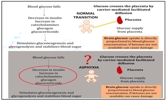Glucose metabolism during normal neonatal transition versus asphyxia-induced dysregulation. Normal transition: Once the umbilical cord is cut, placental glucose supply ceases and blood glucose falls, triggering a decrease in insulin and compensatory increases in catecholamines, glucagon, and glucocorticoids. These hormonal changes mobilize hepatic glycogen stores to maintain blood glucose levels. Brain glucose uptake is directly proportional to blood glucose concentration, ensuring adequate substrate delivery. Asphyxiated newborn: During asphyxia, normal metabolic mechanisms become dysregulated. Excessive catecholamine release and insulin deficiency lead to depletion of cellular glucose stores despite potentially elevated circulating glucose levels. The lack of adequate insulin impairs substrate availability at the cellular level by preventing glucose transporter (GLUT) translocation to cell membranes. This creates a metabolic crisis in which glucose is circulating but cannot effectively enter cells to support energy production. Co-administration of dextrose with insulin may help restore cellular glucose availability and overcome this uptake barrier.