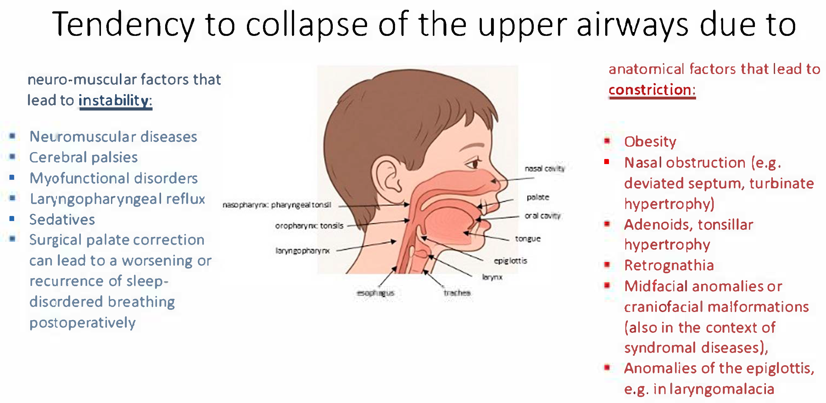 | Obesity, prematurity, cerebral palsy, trisomy 21, Prader–Willi syndrome, Pierre–Robin sequence, craniofacial malformations, dysgnathia, neuromuscular diseases, mucopolysaccharidoses, Chiari 2 malformations, achondroplasia, sickle cell disease |