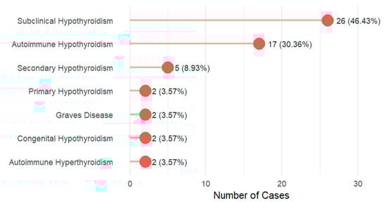 Thyroid dysfunction is the most common endocrine disorder found in individuals with DS, although the reported prevalence varies significantly across different populations and studies. For example, a study from the Philippines found a prevalence rate as high as 56%, primarily due to subclinical hypothyroidism [16]. Other studies reported that thyroid dysfunction is affecting an estimated 4–18% of children [17,18]. This marked variability may stem from differences in regional genetic backgrounds, rates of consanguinity [19], iodine sufficiency [20], diagnostic definitions (especially the TSH cut-off values applied) [21], access to healthcare, and compliance with screening programs, and aspects of study methodology [22]. Thyroid dysfunction is manifestations are diverse, encompassing congenital hypothyroidism, subclinical hypothyroidism, and acquired forms—both autoimmune and non-autoimmune—as well as hyperthyroidism [23]. International pediatric guidelines recommend a consistent thyroid-stimulating hormone (TSH)-based screening protocol for thyroid dysfunction in DS, starting at birth and repeated at 6 months, 12 months, and then annually [24,25,26]. If TSH is abnormal, a free thyroxine (Free T4) test should follow [27]. For patients with subclinical hypothyroidism, more frequent testing is advised [28]. Enhanced monitoring is recommended, especially for patients with positive thyroid antibody tests, as this suggests a higher likelihood of progressing to overt hypothyroidism [29].