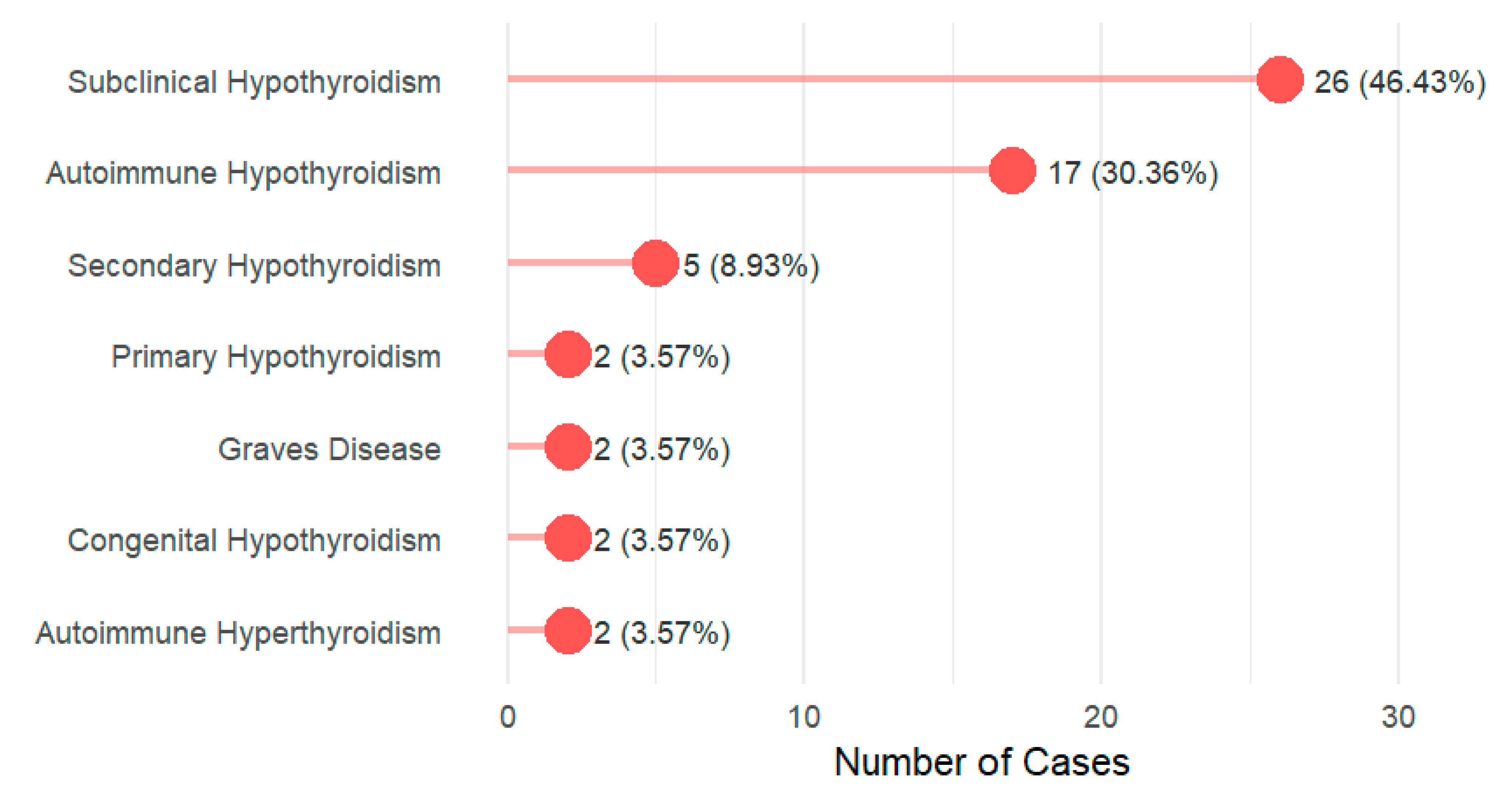 A structured data collection instrument was developed for this study to systematically gather comprehensive clinical information. The instrument covered several key domains, including demographic information (age, gender, weight, height, and body mass index (BMI)); DS characteristics (specific type); and detailed thyroid dysfunction history (diagnosis, type, and treatment). It also recorded clinical signs and symptoms, laboratory assessments (TSH, Free T4, Free T3, and antibody assays including Anti-Thyroglobulin (Anti-TG), Anti-Thyroid Peroxidase (TPO) antibodies, TSH Receptor Antibodies (TRAb)/thyroid-stimulating immunoglobulin (TSI) antibodies), as well as imaging modalities such as thyroid ultrasonography. Additional sections recorded medication history and current treatment, family history of thyroid disease, and follow-up patterns. To evaluate the patient and family perspective, the instrument integrated two specific metrics: (1) a yes/no assessment of care satisfaction (“Were you satisfied with the care your child received during today’s visit?”), and (2) a yes/no question regarding willingness to be contacted for future research studies, as documented on clinic registration forms. Furthermore, the instrument captured documented parental responses to the standardized query, “Are you aware that children with DS are at higher risk for thyroid dysfunction?” during follow-up visits.