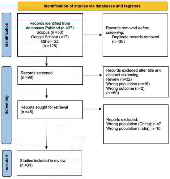 Flow diagram of literature search, according to PRISMA criteria (https://www.prisma-statement.org/prisma-2020, accessed 4 July 2025), with the steps followed in the manuscript selection procedure. After the application of the selection criteria, the initial 128 manuscripts were reduced to 31.