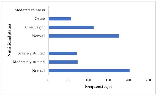 The children’s anthropometric status was determined using the classification cut-offs recommended by the World Health Organization [22]. Weight and height measurements were converted into age- and sex-specific Z-scores using the WHO Anthro and AnthroPlus softwares, which were then used to categorize each child’s nutritional status [22]. The calculated Z-scores were used to categorize each child’s anthropometric status based on the World Health Organization (WHO) reference standards. Stunting was defined as low height-for-age, where a height-for-age Z-score < −2 SD indicated stunting and a Z-score < −3 SD showed severe stunting. Thinness among school-aged children and adolescents was classified using BMI-for-age, with a Z-score < −2 SD indicating thinness and a Z-score of < −3 SD indicated severe thinness. BAZ ≥ −2 SD and ≤ +1 SD was considered normal. On the upper end of the spectrum, BAZ > +1 SD and ≤ +2 SD classified a child as overweight, while a BAZ > +2 SD indicated obesity.