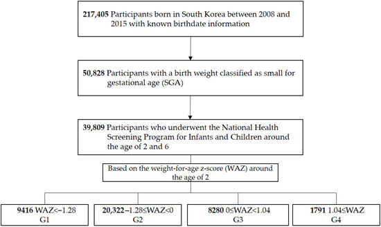 This study included 217,405 children born between 2008 and 2015 with a recorded gestational age in the NHSPIC. Children born SGA were defined as having a birth weight below the 10th percentile for gestational age [12]; 50,828 children met this criterion. Among them, 39,809 completed both the 2-year and 6-year NHSPIC examinations. To evaluate weight catch-up status at age 2, the weight-for-age z-score (WAZ) was calculated using reference values from the 2017 Korean National Growth Charts for Children and Adolescents [13], provided by the World Health Organization [14]. Children were then categorized into four groups according to their WAZ at age 2: G1 (WAZ < −1.28 [10th percentile], n = 9416), G2 (−1.28 ≤ WAZ < 0 [50th percentile], n = 20,322), G3 (0 ≤ WAZ < 1.04 [85th percentile], n = 8280), and G4 (1.04 ≤ WAZ, n = 1791) (Figure 1). The G2 group was used as the reference group.