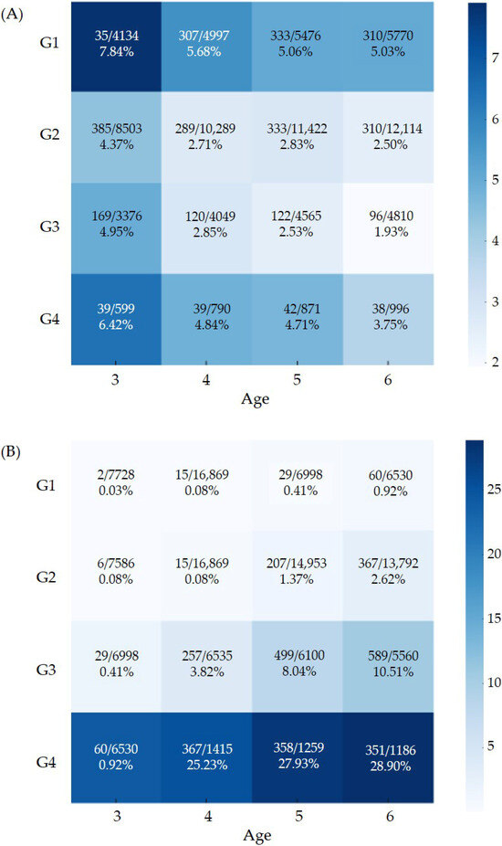 Characteristics of the study population are presented in Table 1. A total of 39,809 participants were enrolled, with 9416, 20,322, 8280, and 1791 in the G1, G2, G3, and G4 groups, respectively. The proportions of boys and girls were comparable across all groups. No significant differences in economic status were observed among the G1, G2, and G3 groups. However, the G4 group had a higher proportion of children with low economic status (29.5% vs. 23.5–24.6%).