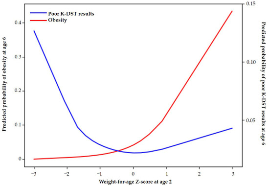 Predicted probabilities of obesity and suboptimal K-DST outcomes at age 6 according to the Z-score of weight-for-age at 2 years.
