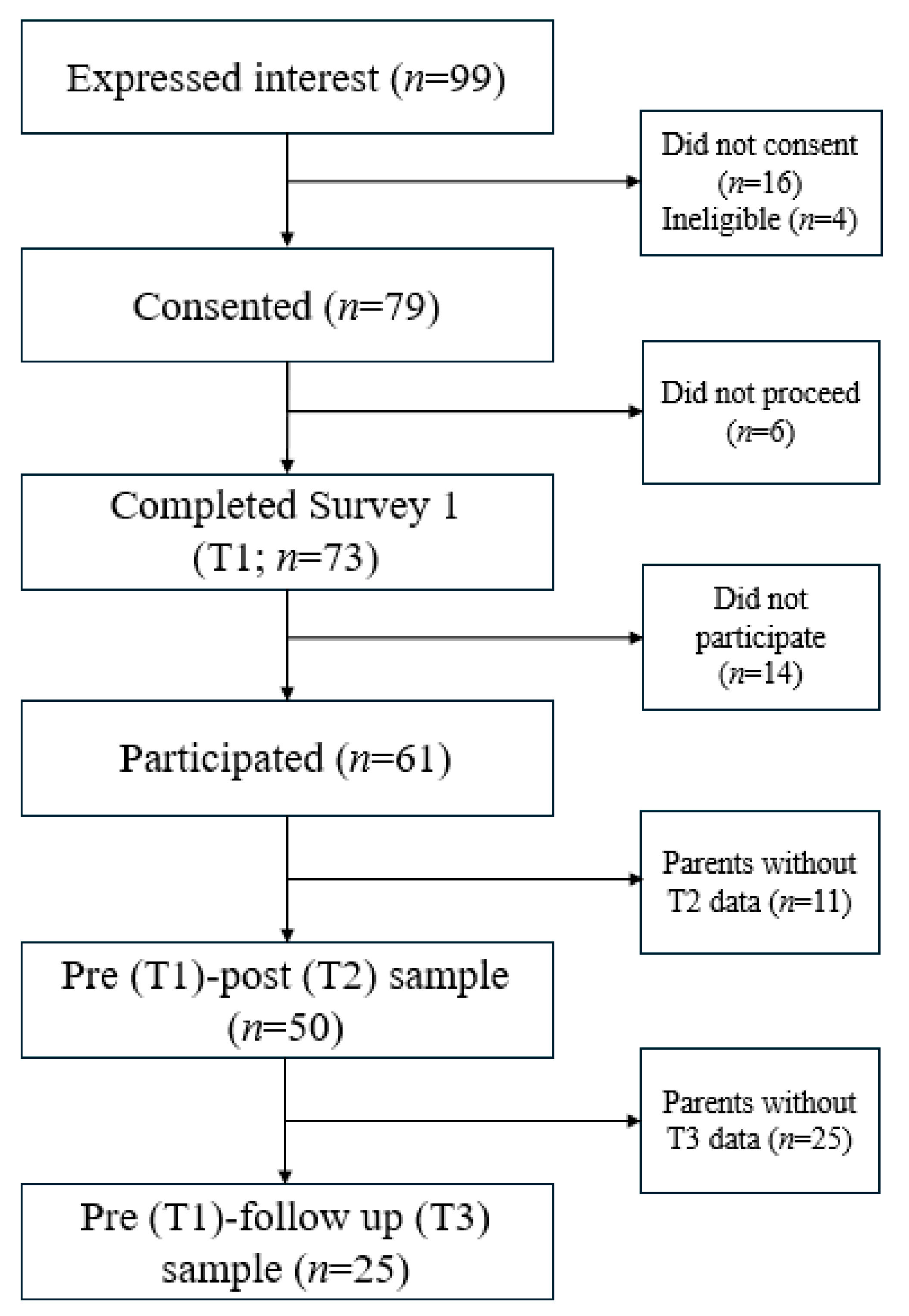 Over a five-month recruitment period (March–July 2024), 99 parents initiated registration for MERTIL for Parents and were screened for eligibility. Of these, 79 met inclusion criteria, consented to participate, and were provided access to the program. Participant engagement and completion were monitored for approximately eight months, concluding in October 2024. During this time, 61 parents completed the full intervention, representing 77.2% of those who consented and 83.6% of parents who commenced the program (defined as completing at least one video module). On average, participants completed the program in 9.85 days (SD = 12.73; min = 1 day, max = 15 days). At the three-month follow-up, outcome data were available from 41.0% of program completers. The study flow is depicted in Figure 1.