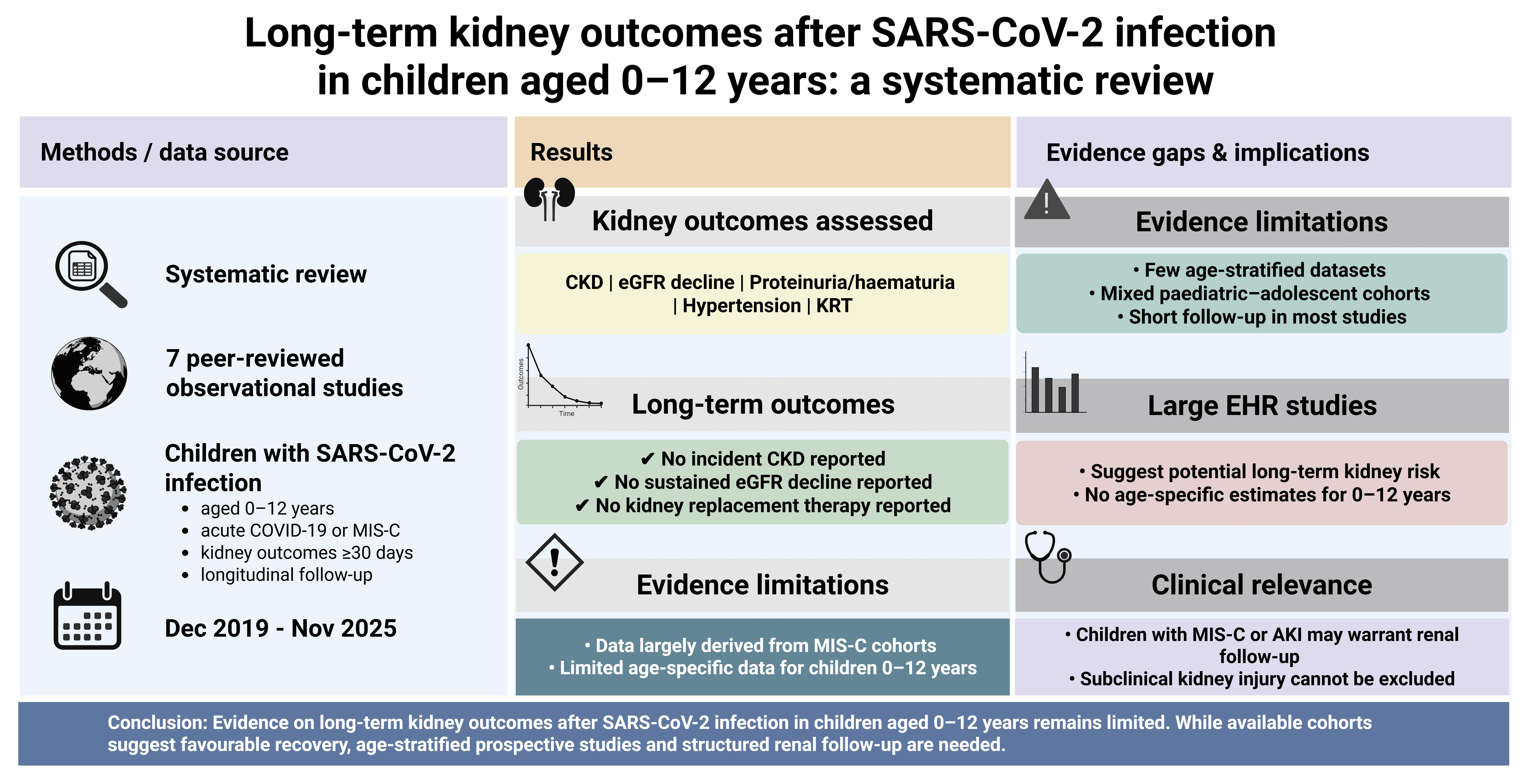 (a) Kidney outcomes reflect the full MIS-C or PIMS-TS cohort; age-specific results for children 0–12 years were not reported and cannot be separated [27]. Abbreviations: AKI, acute kidney injury; CKD, chronic kidney disease; COVID-19, coronavirus disease 2019; d, days; eGFR, estimated glomerular filtration rate; EHR, electronic health record; HTN, hypertension; KRT, kidney replacement therapy; MIS-C, multisystem inflammatory syndrome in children; mo, month; PIMS-TS, paediatric inflammatory multisystem syndrome temporally associated with SARS-CoV-2; wk, week.