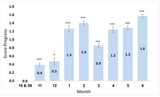 Calculations were carried out by SPSS 23.0 software. A criterion of α < 0.05 was set as the significance level for the results, for two missing data imputation procedures were applied. For testing normality distribution, a Kolmogorov–Smirnov Lilliefors Significance Correction was applied for the score variable. A linear regression was performed with repeated measurements by month. The confounders’ communication and play advancements, interactions that express the number of treatments each month were neutralized by including them in the regression to relate only to the effect of progress in the timeline. September and October were introduced as a control group with no intervention program and served as a reference for measuring progress in subsequent months.