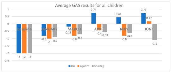 Goal Attainment Scale (GAS)—GAS is a well-known, established method of measuring individual progress against individual goals adapted to each child [35]. It is a mathematically based technique [36]. The psychometric properties of the scale were evaluated, and it was found to be reliable and valid [37], as well as responsive to change [36] while being used to assess a variety of topics with different populations across different settings [36,38]. GAS was reported as a promising measurement approach when assessing children with ASD [39]. GAS is a 5-point scale, with −2 representing the participant’s current functional level. A score of 0 represents the expected level of functional achievement at the end of the intervention program. A score of −1 is the score when achievements have been made from the baseline status, which did not progress to the full expected goal (0). If a patient achieves more than was expected, based on pre-established criteria, a score of +1 (more than expected) or +2 (much more than what was expected) is given, depending on the level of achievement. Available evidence supports GAS scaling reliability and validity [40]. When using the GAS in the current research, 90 s videos were filmed every morning at 08:30 a.m., during free play in the kindergarten, by the care-providing staff.