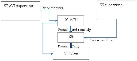 The hybrid treatment was provided by a certified healthcare professional, a Speech Therapist (ST) or Occupational Therapist (OT) in cooperation with an Educational Supporter (ES) in accordance with the guidelines of the manual of the hybrid model treatments. The roles within the hybrid model and description of the role holders are presented in Table 2 and Figure 1):