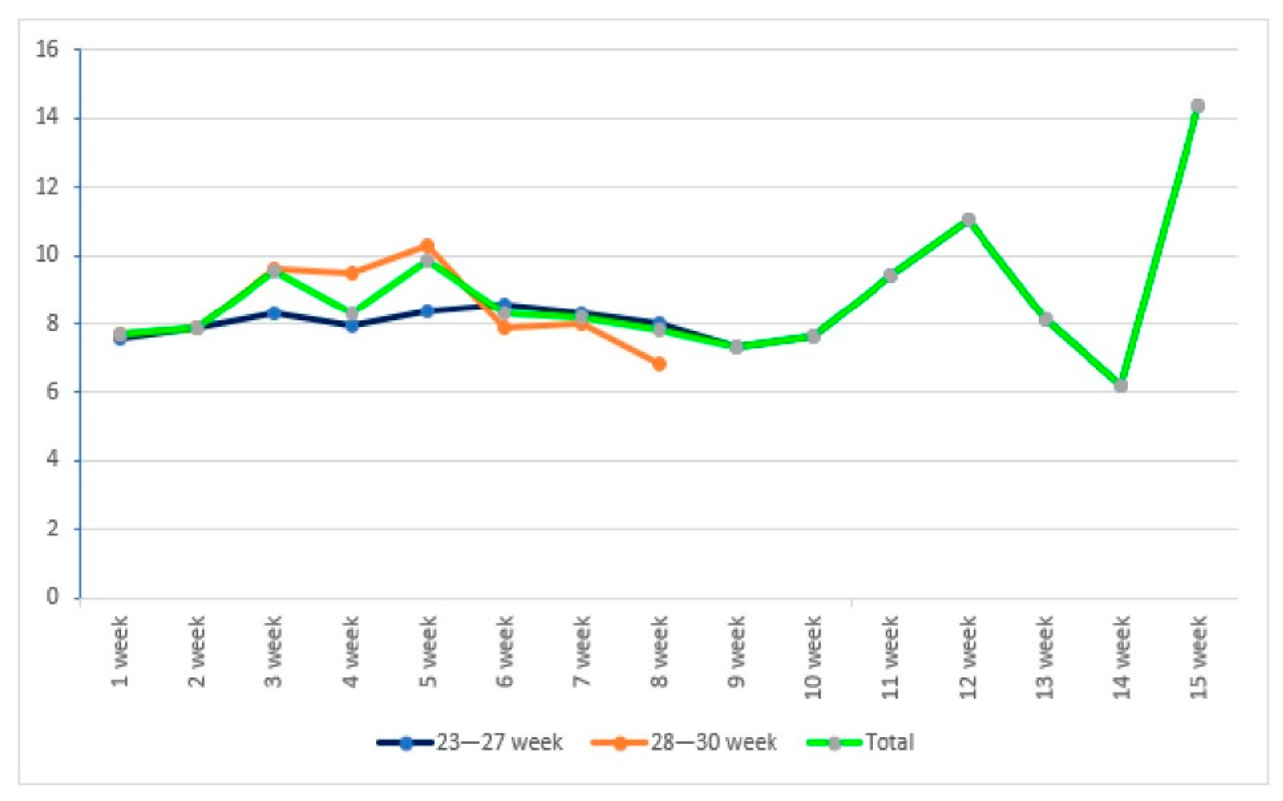 | Weeks | N | <23–1000g (n = 55) | N | >1000g (n = 49) | N | Total | p |