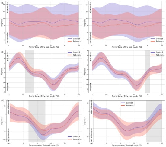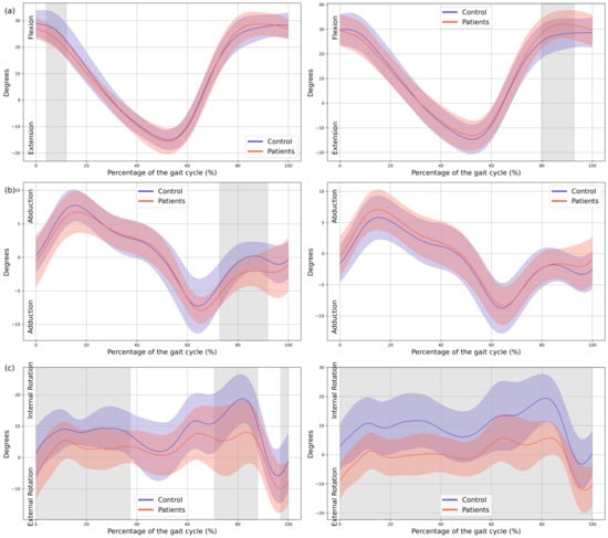Hip kinematics. (a) Sagittal plane; (b) Frontal plane; (c) Transverse plane. The X-axis represents the normalized gait cycle percentage from 0 to 100, and the Y-axis represents the angle in degrees. The left panels compare the dominant side of the healthy controls (blue line) with the less affected side of the patients (red line), and the right panels compare the non-dominant side (blue line) with the more affected side (red line). The red and blue band indicates the standard deviation of the patients and healthy controls respectively. The gray band indicates the percentage of the gait cycle in which statistically significant differences between groups were observed.