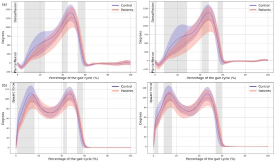 Kinetics. (a) Ankle internal moment, where positive values indicate an internal plantarflexion moment; (b) Ground reaction force (GRF), where positive values indicate upward force. The X-axis represents the normalized gait cycle percentage from 0 to 100, and the Y-axis represents the magnitude of the kinetic variable in standard units. The left panels compare the dominant side of the healthy controls (blue line) with the less affected side of the patients (red line), and the right panels compare the non-dominant side (blue line) with the more affected side (red line). The red and blue band indicates the standard deviation of the patients and healthy controls respectively. The gray band indicates the percentage of the gait cycle in which statistically significant differences between groups were observed.